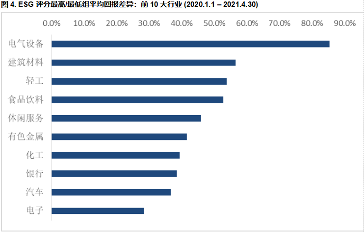 我們觀察到,在28個申萬一級行業中的24個中, ESG行業領先者(ESG評分最高20%組)都在一定程度上跑贏了落后者,ESG行業領先者優勢最大的前十大行業中,平均收益的優勢在28.4%到85.2%之間,其中分度最明顯的是電氣設備,建筑材料,輕工行業和食品飲料,如圖4所示。
