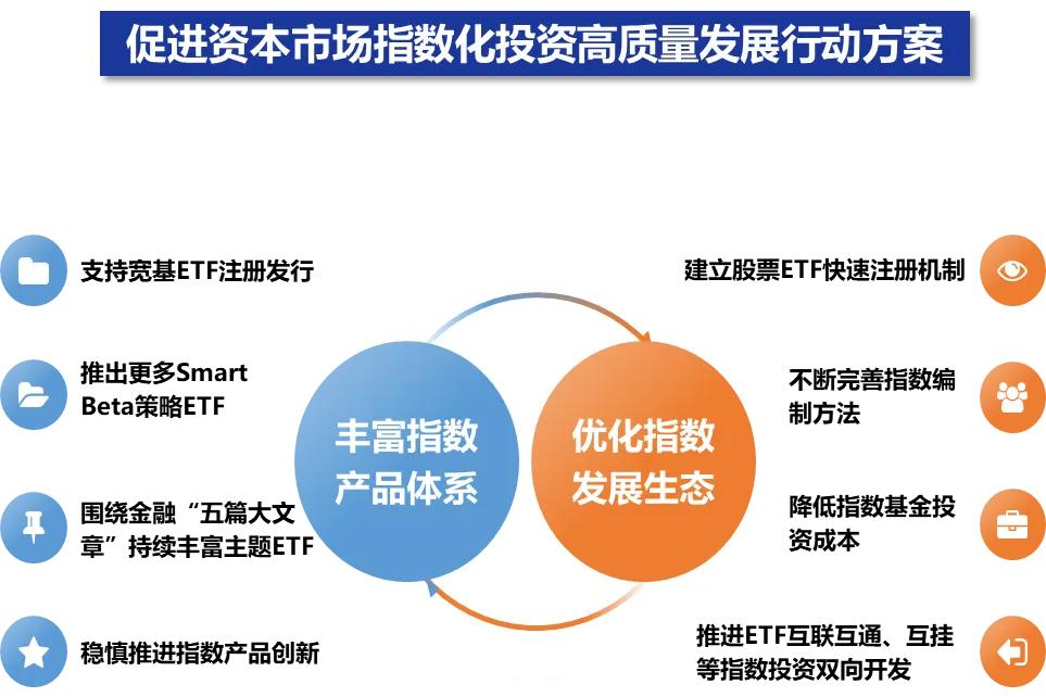 新“國(guó)九條”提出,大力發(fā)展權(quán)益類公募基金,大幅提升權(quán)益類基金占比,建立交易型開放式指數(shù)基金(ETF)快速審批通道,推動(dòng)指數(shù)化投資發(fā)展。