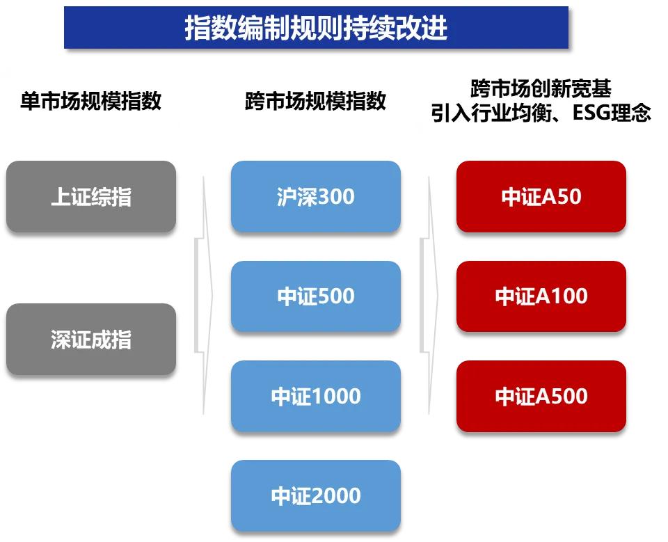 從最早的上證、深證單市場(chǎng)綜合指數(shù),到以滬深300、中證500為代表的規(guī)模寬基指數(shù),實(shí)現(xiàn)了對(duì)A股資產(chǎn)市值結(jié)構(gòu)的全面表征,再到中證A500為核心的A系列創(chuàng)新寬基指數(shù),精選細(xì)分行業(yè)龍頭、兼顧行業(yè)均衡,并且引入國(guó)際先進(jìn)的ESG投資理念,指數(shù)的表征性和深度投資價(jià)值進(jìn)一步提升。