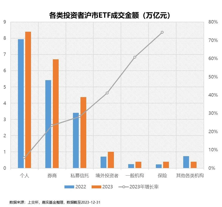 根據(jù)劉斌的介紹,近年來除了ETF客戶總量和機(jī)構(gòu)持有規(guī)模總量快速提升,細(xì)分投資者也日益多元和交易活躍。根據(jù)上交所披露的數(shù)據(jù),在持倉(cāng)方面,各細(xì)分機(jī)構(gòu)投資者的持倉(cāng)規(guī)模均顯著增長(zhǎng),其中私募機(jī)構(gòu)已成為配置ETF的中堅(jiān)力量,而以保險(xiǎn)、年金為代表的長(zhǎng)線資金也呈現(xiàn)出明顯增配ETF的趨勢(shì)。在交易活躍度方面,個(gè)人投資者、券商和私募的成交額均大幅提升。
