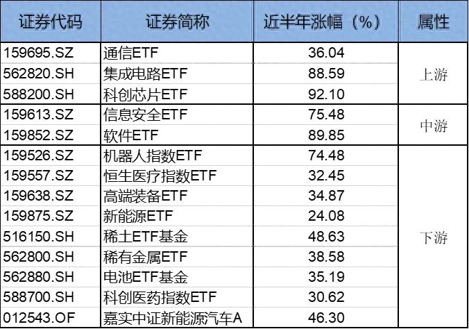 不止是單只產品的領先,嘉實基金在多個細分領域的產品簇也是頗為豐富。以今年大漲的科技賽道為例,從2023年初的ChatGPT引爆市場,后續各種突破性創新作為催化劑,AI產業鏈的各個細分領域均展現出你方唱罷我登場的熱鬧格局。下圖為截至3月14日,近半年漲幅:
