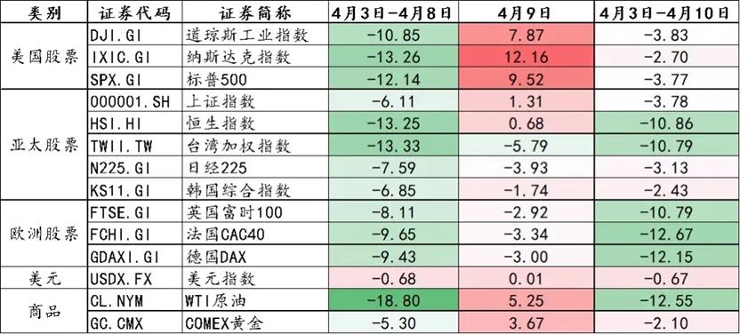 4月3日至4月8日全球股市大幅下挫,美國、中國、法國、德國股票指數連續下跌;工業品普跌,原油下跌近20%;美元走弱,美元信用趨弱;美債收益率驟降,后由于流動性壓力美債被大幅拋售,美債收益率迅速提升;黃金上漲,市場短時間內走向避險交易。