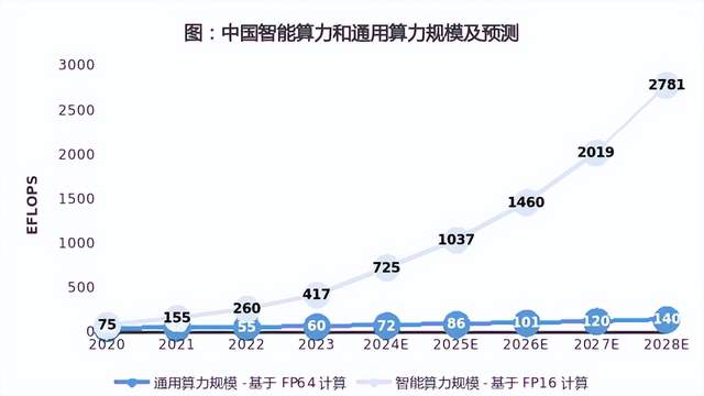 未來(lái)80%的場(chǎng)景都將基于人工智能,所占據(jù)的算力資源由智算中心提供[1]。預(yù)測(cè)顯示,2023-2028年,中國(guó)通用算力和智能算力的五年年復(fù)合增長(zhǎng)率將分別達(dá)到18.8%、46.2%。