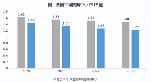 在國(guó)家大力推動(dòng)綠色數(shù)據(jù)中心建設(shè)的背景下,我國(guó)數(shù)據(jù)中心的平均電能利用效率呈現(xiàn)逐步提升的趨勢(shì)。PUE(電能利用效率,Power Usage Efficiency)是用來(lái)衡量數(shù)據(jù)中心用能效率的關(guān)鍵指標(biāo),代表數(shù)據(jù)中心消耗的所有能源與IT設(shè)備消耗的能源之比,PUE=1最為理想,意味著所有能耗都用于服務(wù)器設(shè)備運(yùn)轉(zhuǎn),無(wú)其他能耗開銷。近幾年,全國(guó)數(shù)據(jù)中心的PUE值呈下降趨勢(shì),國(guó)家綠色數(shù)據(jù)中心的評(píng)級(jí)PUE值已降至1.22,有效發(fā)揮標(biāo)桿引領(lǐng)作用。