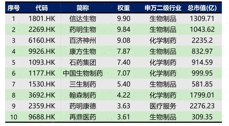 中證港股通創(chuàng)新藥指數(shù)前十大權重股