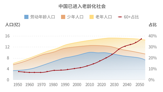預計到2050年,我國60+人口將達到35%左右,老齡化壓力大。